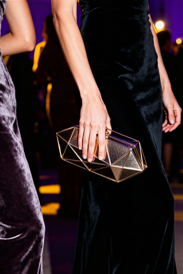 Pair a silk, velvet, or sequined dress with a structured, sculptural bag—geometric metal clutches or architectural minis work beautifully. The contrast adds dimension to your look and subtly signals your attention to detail.
